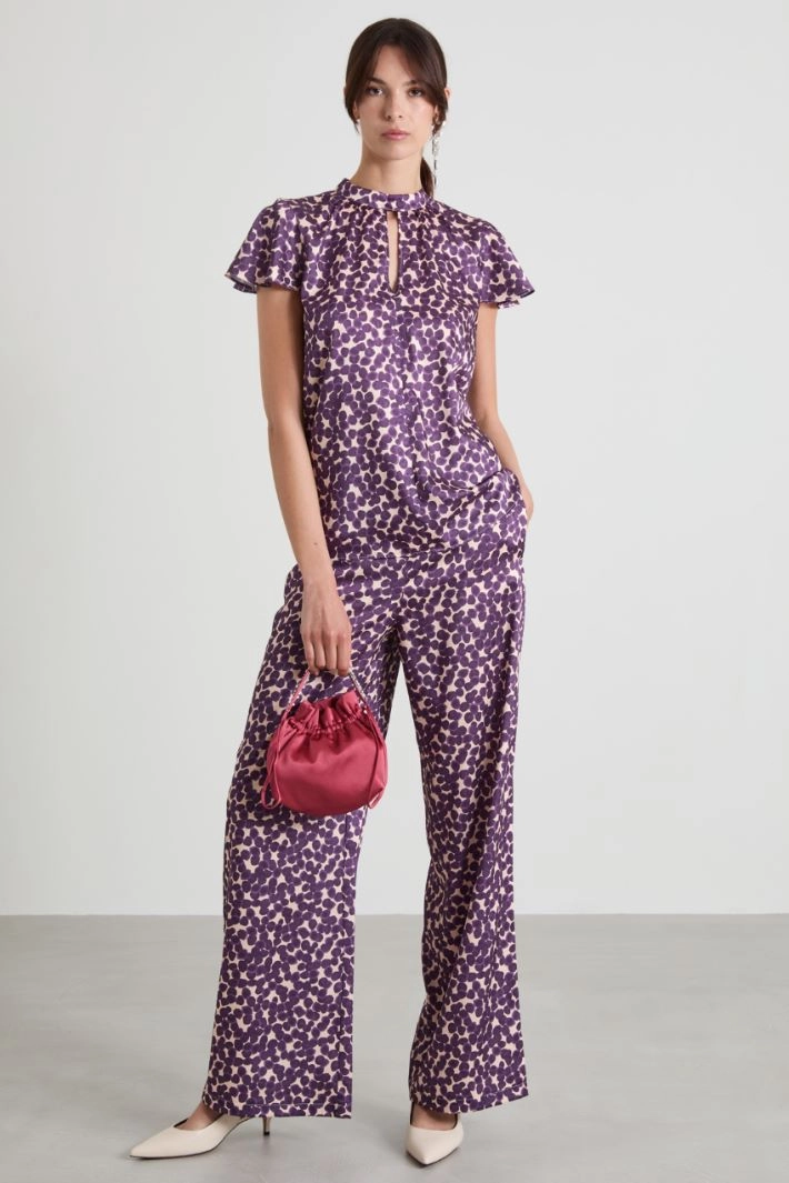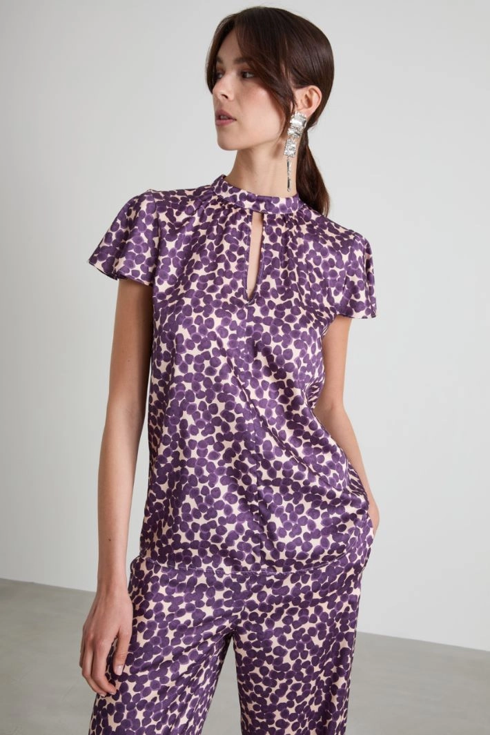 Straight-cut blouse in printed twill, with a stand-up collar, a teardrop opening on the front and a V-shaped opening on the back, and butterfly sleeves. Button fastening on the back of the collar. Matching belt.