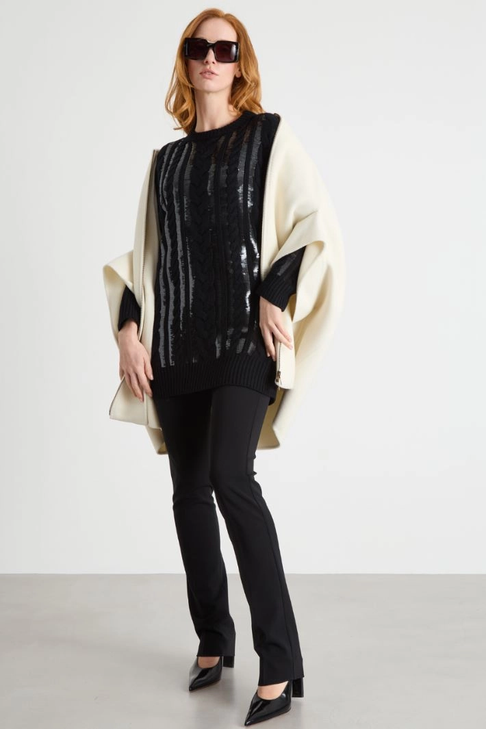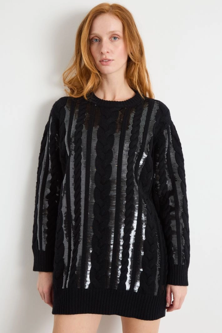Straight-fit short dress in cable-knit wool and cashmere yarn, featuring tonal sequin embroidery on the front. This piece features a round neck, long dropped-shoulder sleeves and ribbed trims.