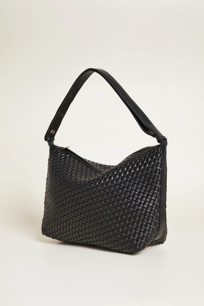 Shoulder bag crafted from woven coated fabric, with an adjustable shoulder strap, an internal zip pocket and protective metal feet. Zip fastening.