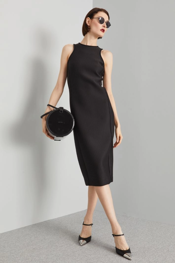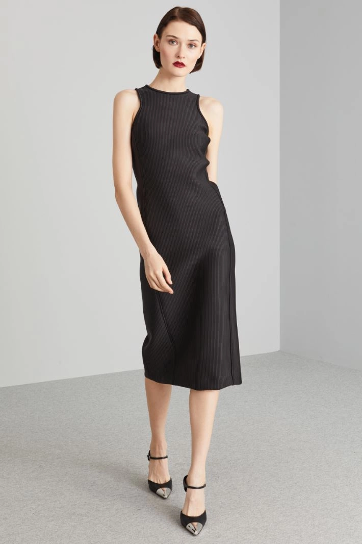 Semi-fitted sleeveless sheath dress in compact stretch jersey, with pinstripe pattern, crew neck, thick shoulder straps, slit and zip fastening on the back.