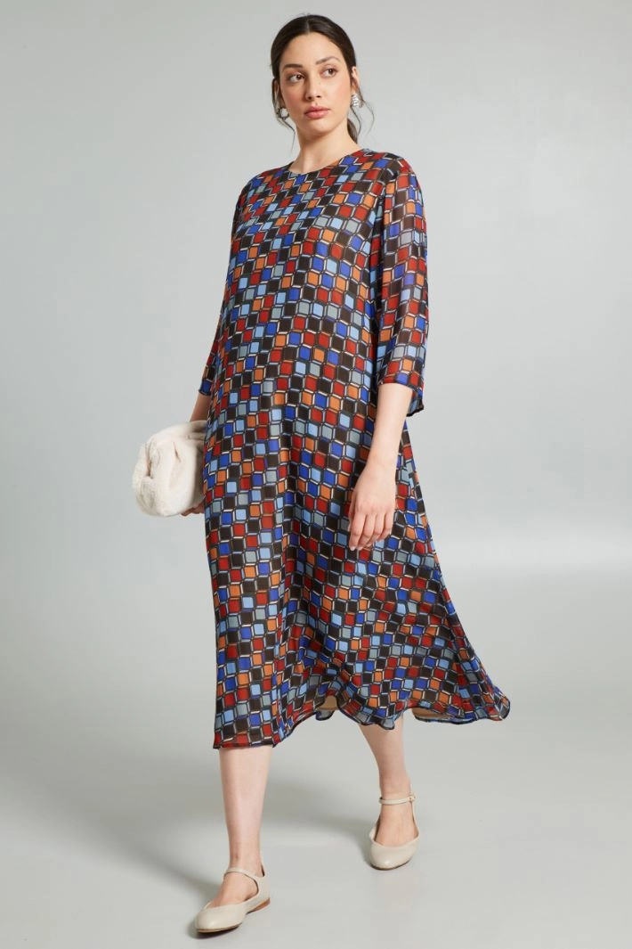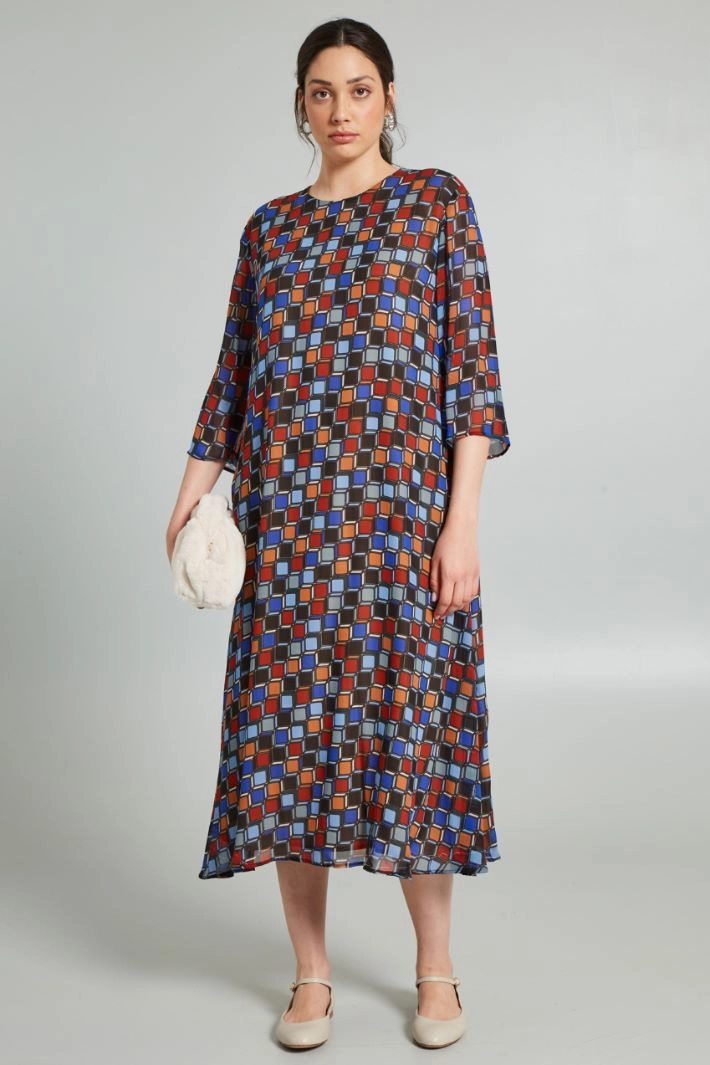 A-line dress in printed viscose georgette, with round neck and three-quarter sleeves. Zip fastening on the back. Lined.