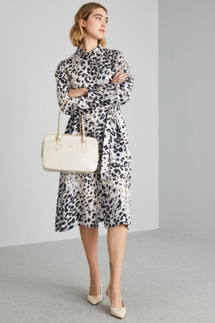 Midi flowy shirt dress in printed pure silk twill, with classic collar, long sleeves with cuff and buttons, side slits at the hem. Hidden button fastening and matching belt.