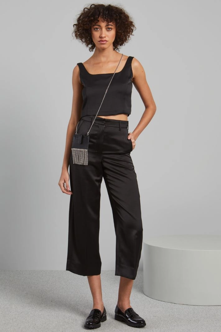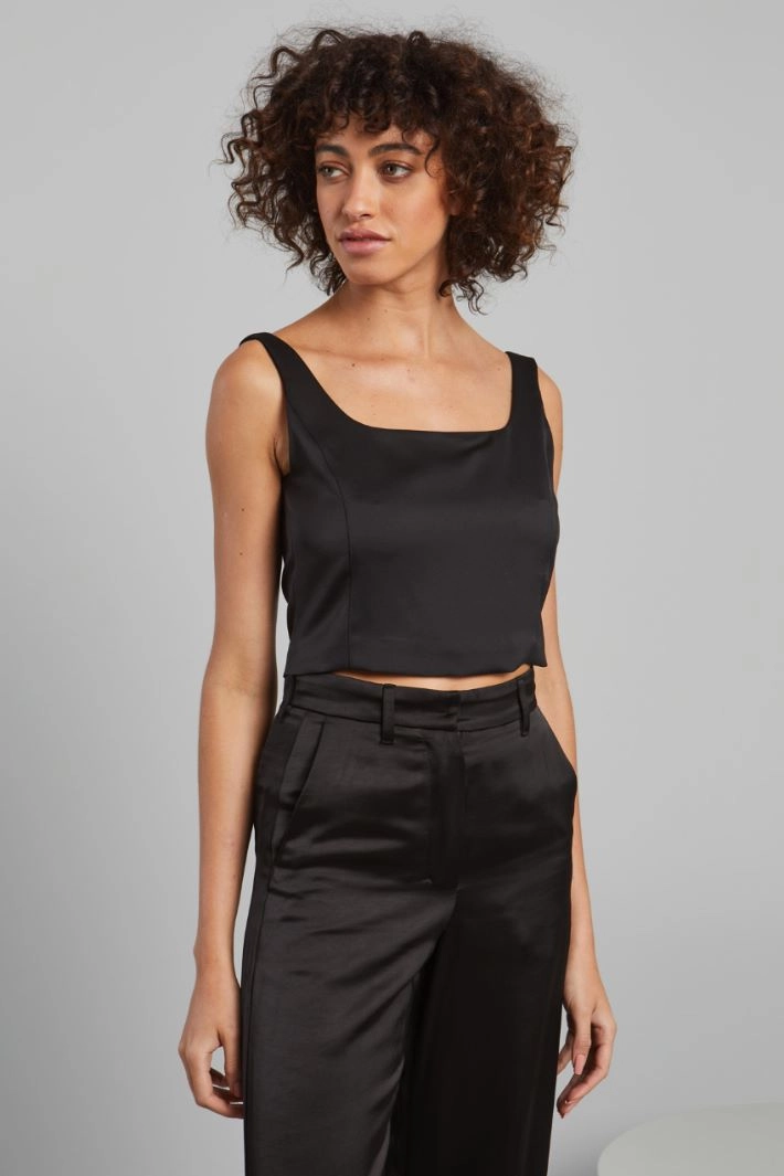 Slim-fit sleeveless crop satin top with wide square neckline and thick straps. Invisible zip fastening on the back. Lined.
