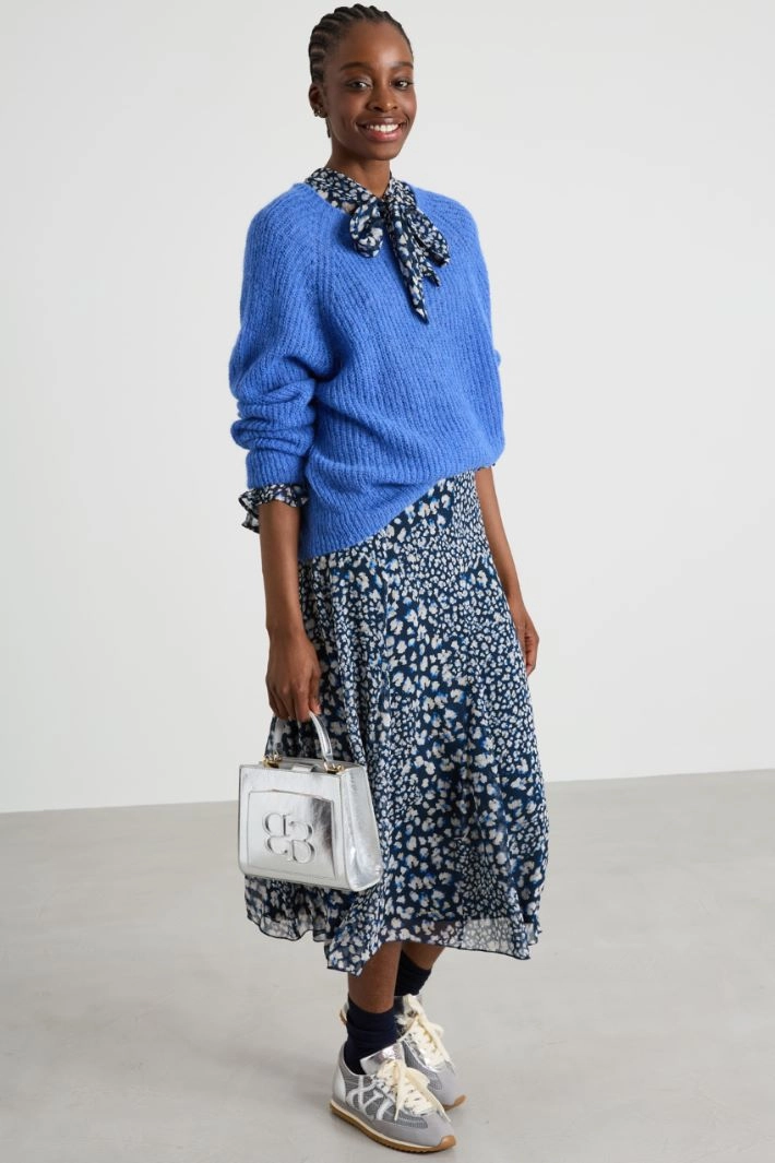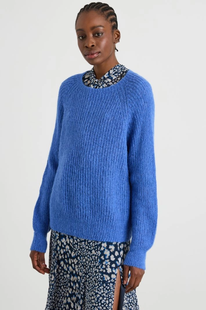 Loose-fit sweater in alpaca blend yarn, with rounded neckline and long raglan sleeves.