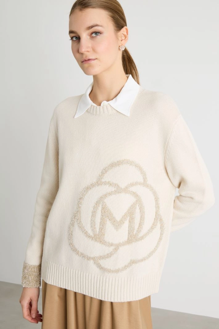 Crafted from a viscose and wool blend yarn, this straight-fit jumper features a round neckline, long sleeves, intarsia detailing and cuffs finished in a metallic yarn. Ribbed trims.