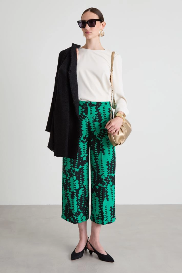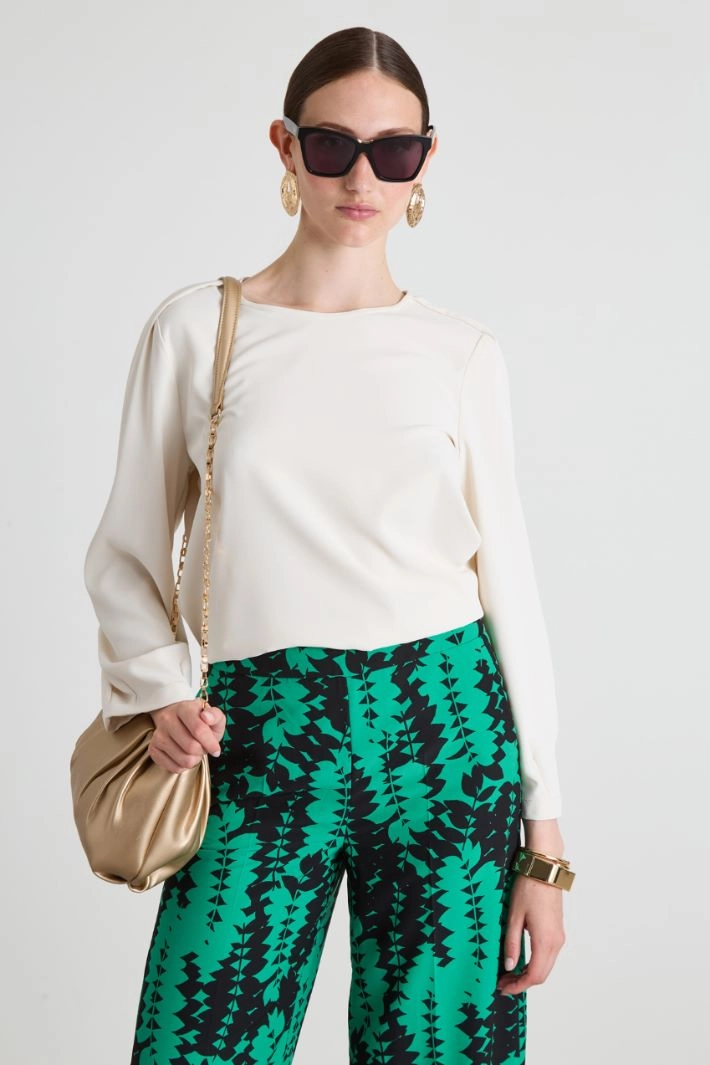 Loose-fitting blouse in lightweight crepe, with crew neck and long sleeves. Teardrop fastening with button.