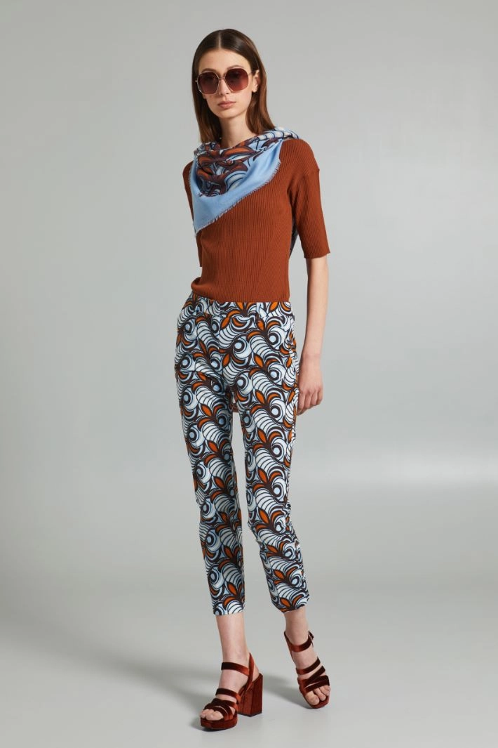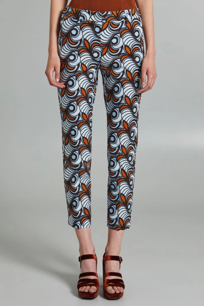 Cigarette trousers in printed stretch cotton faille, with belt loops at the waist, slant pockets at the front and double welt pockets with button at the back. Hidden fastening with zip, button and hook.