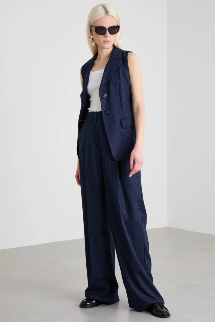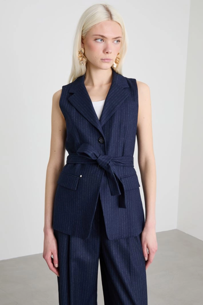 Semi-fitted pinstriped gilet in wool and viscose flannel blend, with lapel collar, flap pockets and matching belt. Button fastening. Lined.