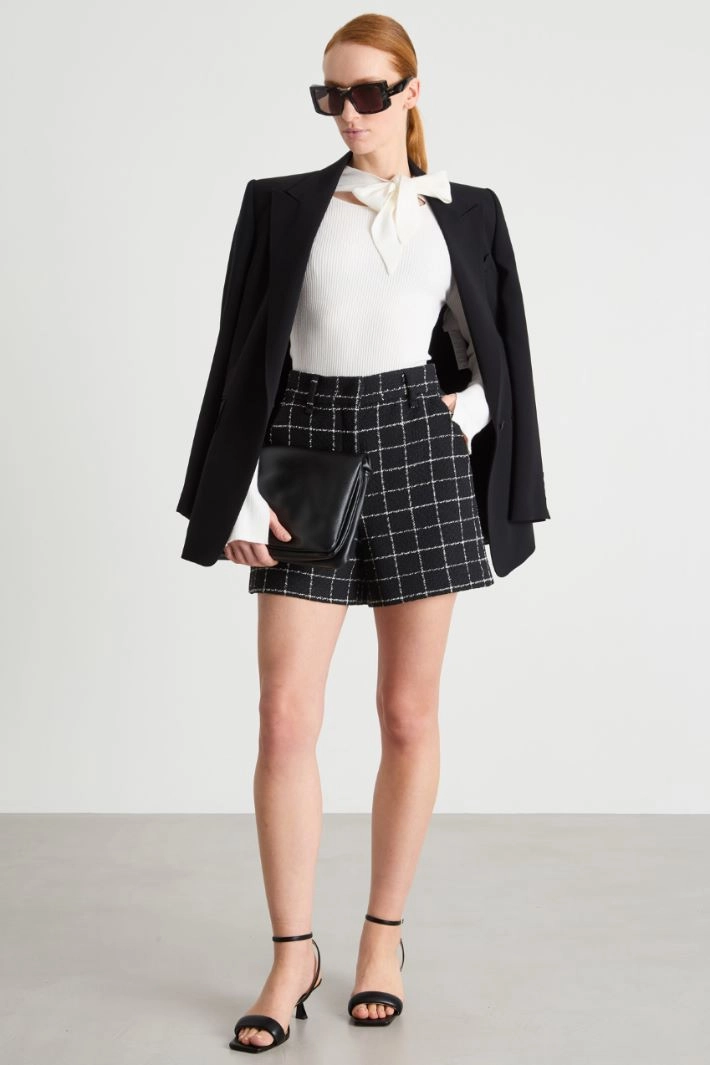 A slim-fit jumper crafted from a viscose-blend yarn, characterised by an elegant scarf-style collar and long sleeves. Finished with ribbed trims.