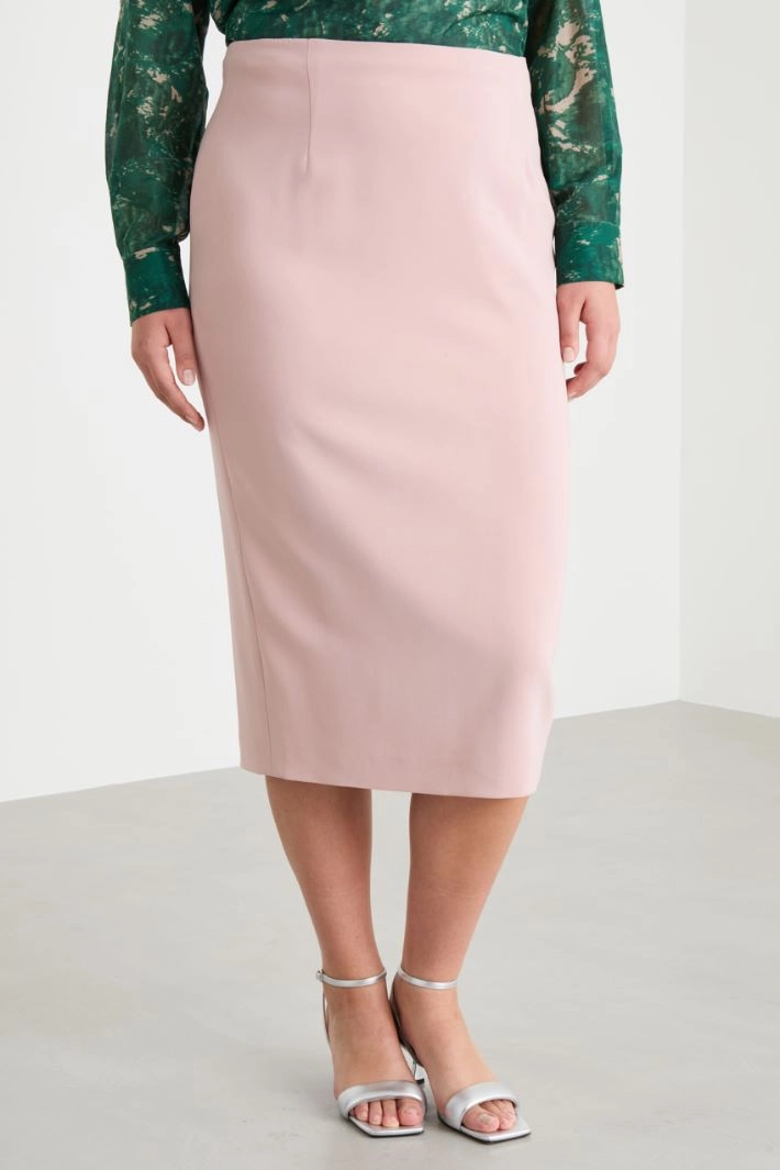 Pencil skirt crafted in cady, featuring waist darts and a vent at the back hem. Invisible zip fastening.