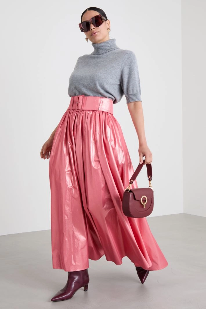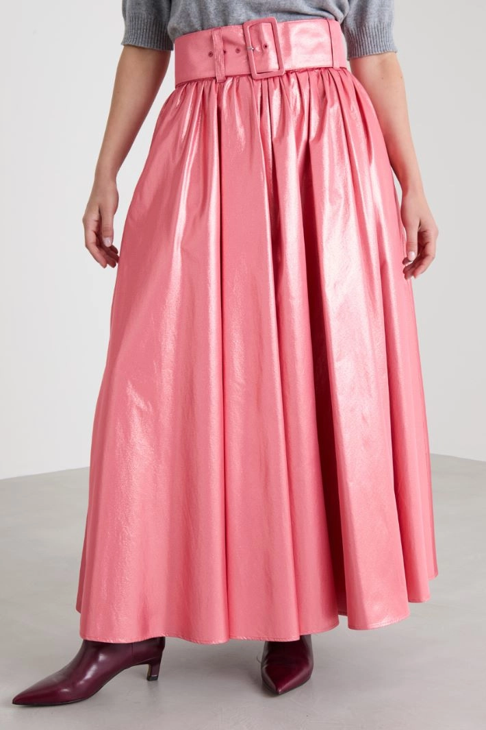 Wide-cut skirt in laminated taffeta, with belt loops, inset side pockets and fastening with invisible zip and covered buttons on the back. Matching belt.