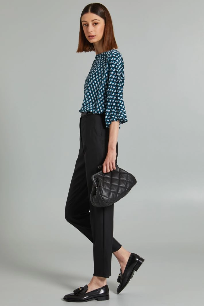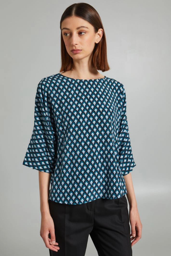Loose fit blouse in printed silk crepe de chine fabric with a crew-neck front with button-adorned keyhole detail and inverted pleat at the back, tie-embellished 3/4 sleeves.