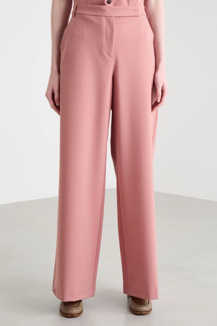 Wide-leg trousers in wool-blend gabardine, featuring belt loops, French pockets on the front and welt pockets on the back. Concealed hook and zip fastening.