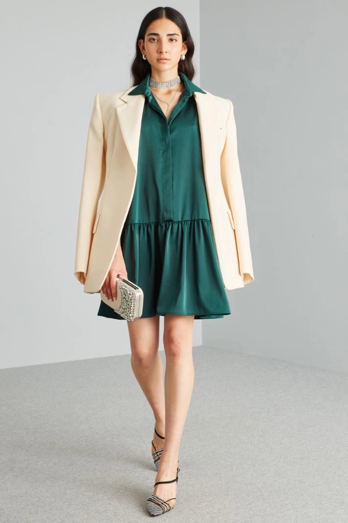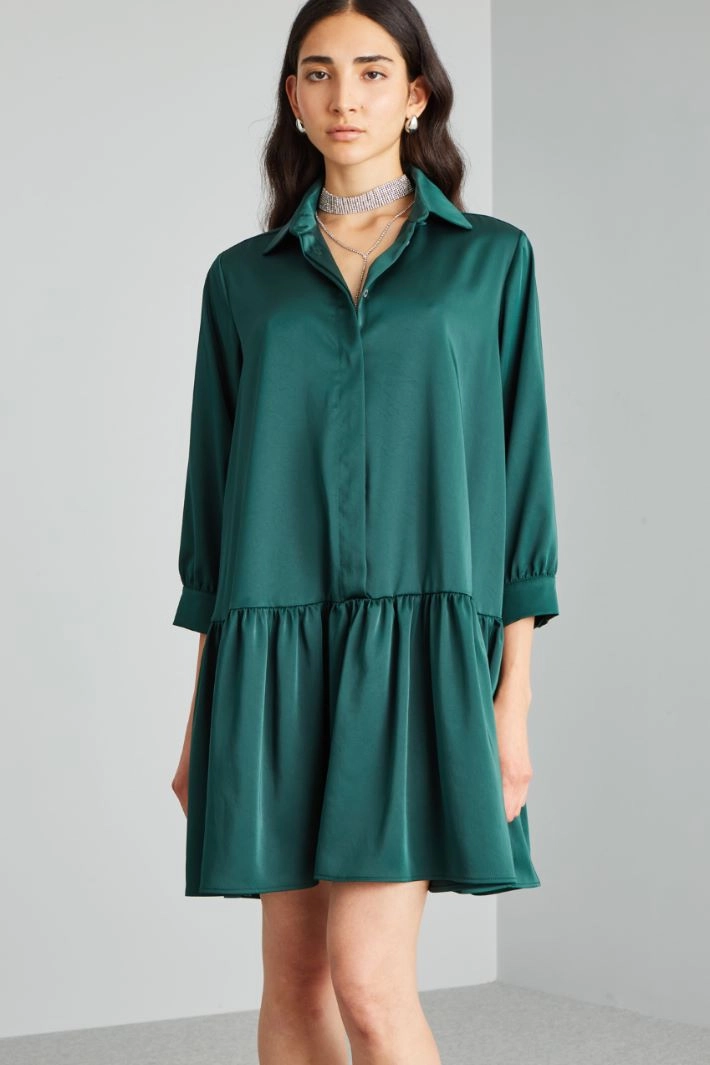 Short flared satin dress with shirt collar and long sleeves with cuff. Fastening with hidden buttons.