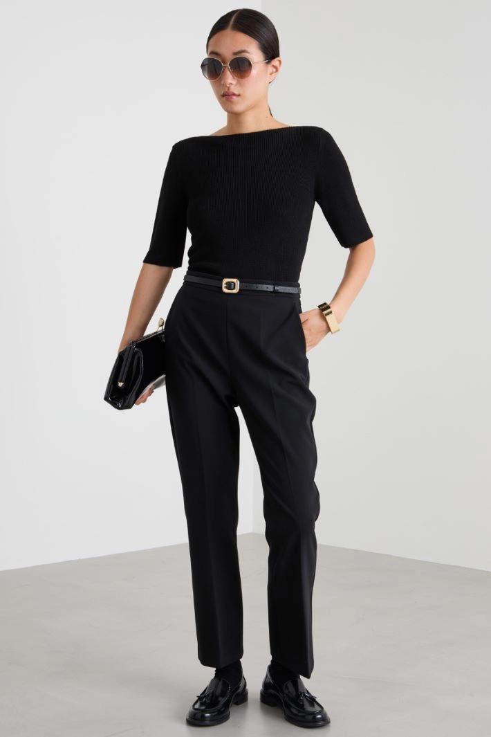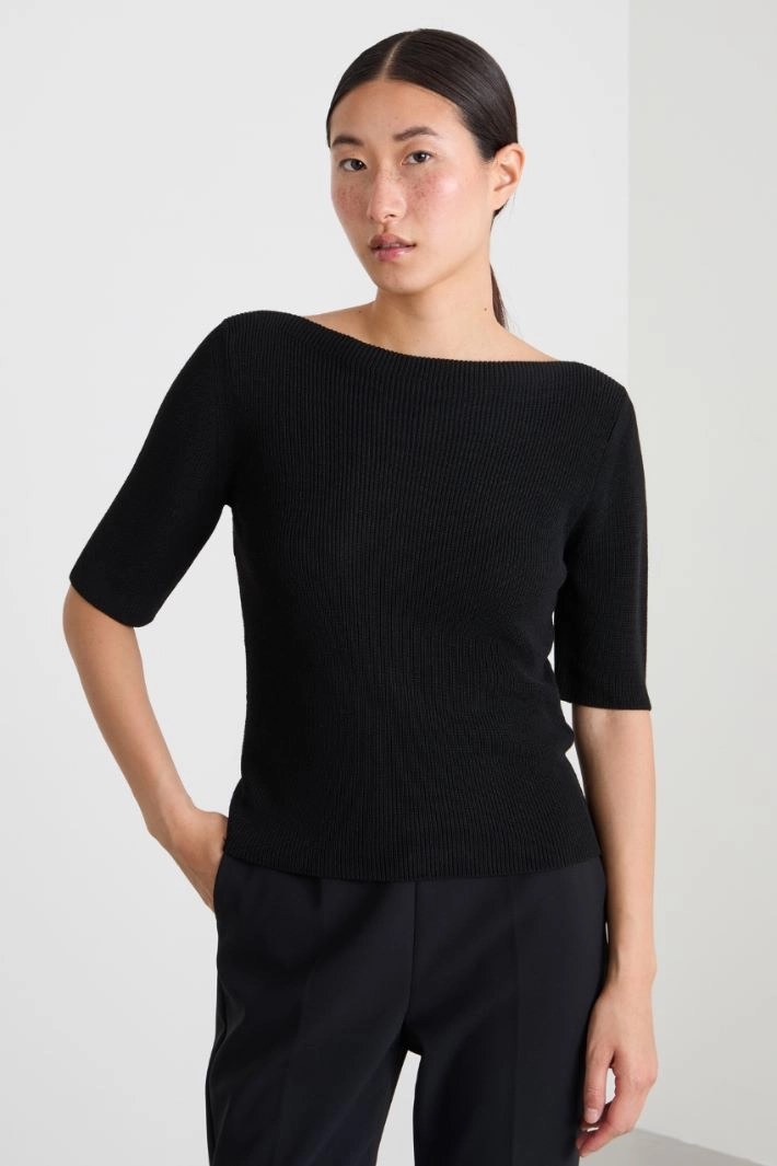 Slim-fit English rib sweater in viscose blend, with a boat neckline and short sleeves.